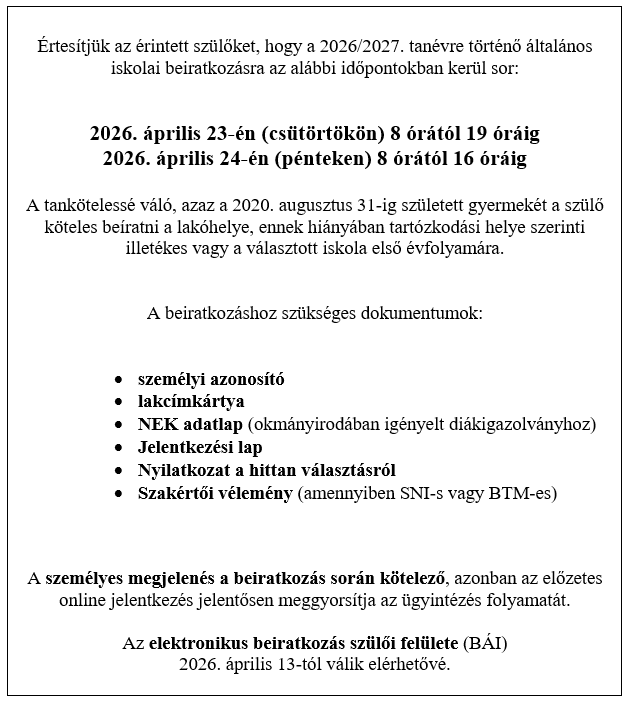 “A tanév rendjéről szóló 27/2025. (VII. 24.) BM rendelet alapján a 2026/2027. tanév általános iskola első évfolyamára történő beiratkozás dátuma: 2026. április 23-24. (csütörtök-péntek).