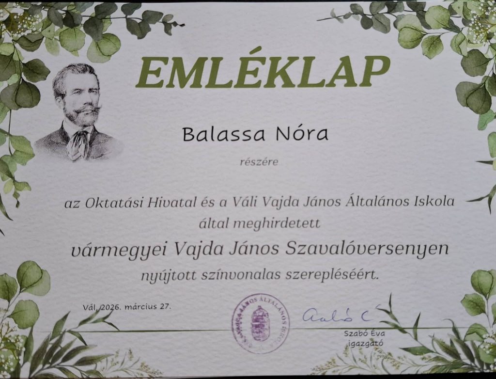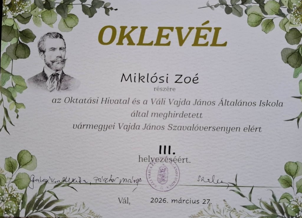 Az Oktatási Hivatal és a Váli Vajda János Általános Iskola által meghirdetett vármegyei Vajda János szavalóversenyen Robotka Áron 2.b és Sörös Luca 4.a osztályos tanulóink vettek részt.Sörös Luca 3.helyezést ért el.